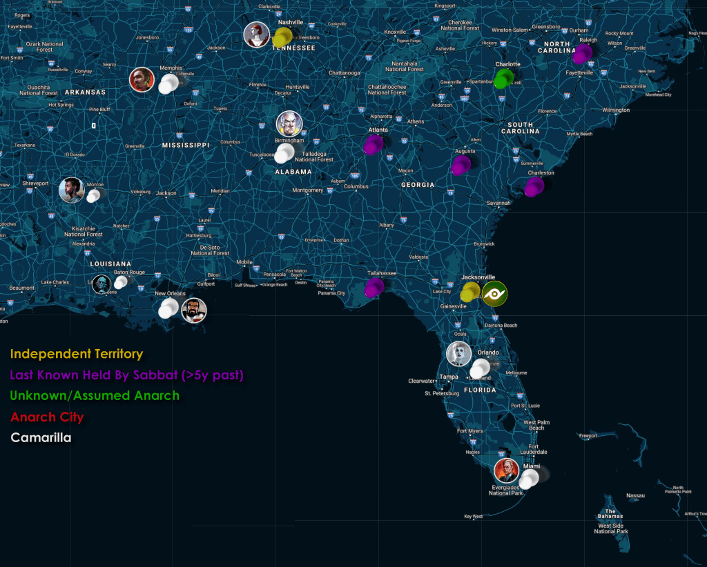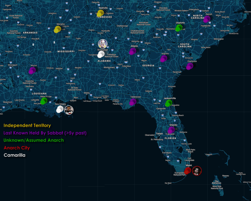 I went ahead and made this map, stylistically. Feel free to snatch it up–I think it looks plenty cool. I wanted to keep the game boxed into the South, so the coterie–who are agents of an invented NPC Archon to Justicar Lucinda–are given the major campaign task of bringing the Southern Cities that are no longer properly under Camarilla control into the fold of the Ivory Tower and those that are back into a renewed relationship with an ascendant Chicago.