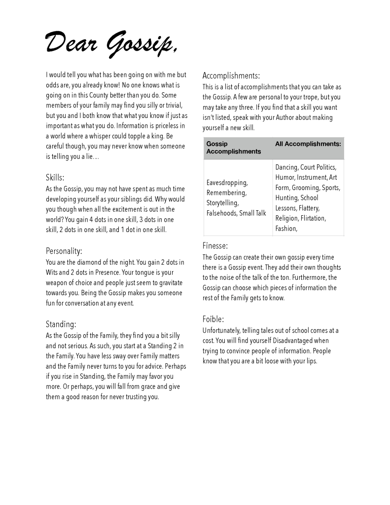 The Family System will both help and hinder the players around the table which will create fun stories to build together. The Tropes can work in harmony for one another or work to hinder each other if need be. Perhaps your sister is about to run off with a soldier who is a secret gambler and you have to stop her or your Family’s Status would definitely drop. But perhaps you’re running off with the love of your life, regardless of what will happen to your Family’s Status because love is more important.
